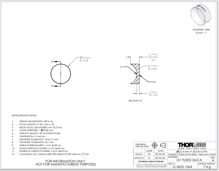 Thorlabs索雷博 LC4252-1064 平凹透镜
