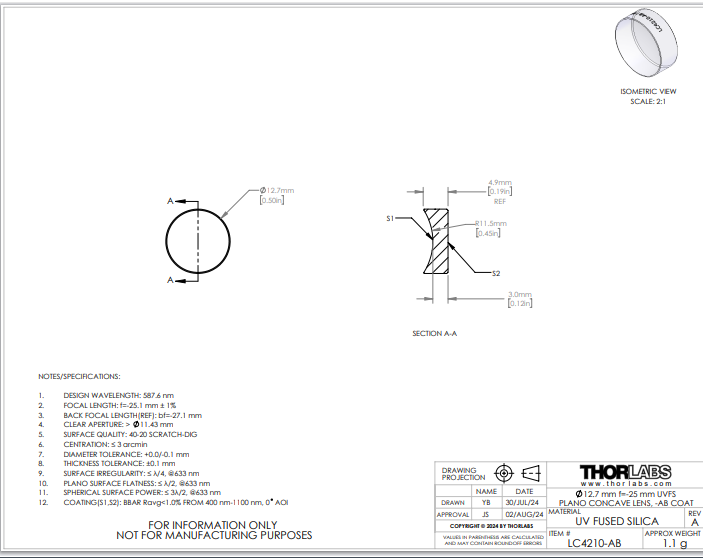 Thorlabs索雷博     LC4210-AB   平凹透镜