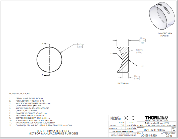 Thorlabs索雷博 LC4291-1550 平凹透镜