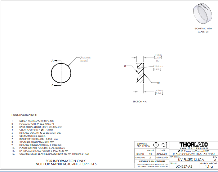 Thorlabs索雷博 LC4357-AB 平凹透镜