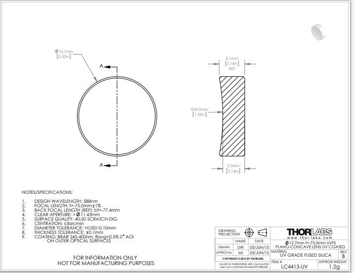 Thorlabs索雷博 LC4413-UV 平凹透镜