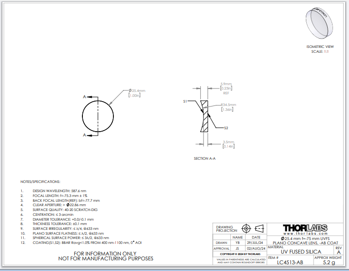 Thorlabs索雷博 LC4513-AB 平凹透镜
