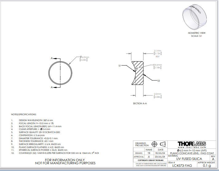 Thorlabs索雷博 LC4573-YAG 平凹透镜