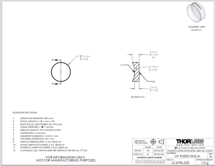 Thorlabs索雷博 LC4796-532 平凹透镜