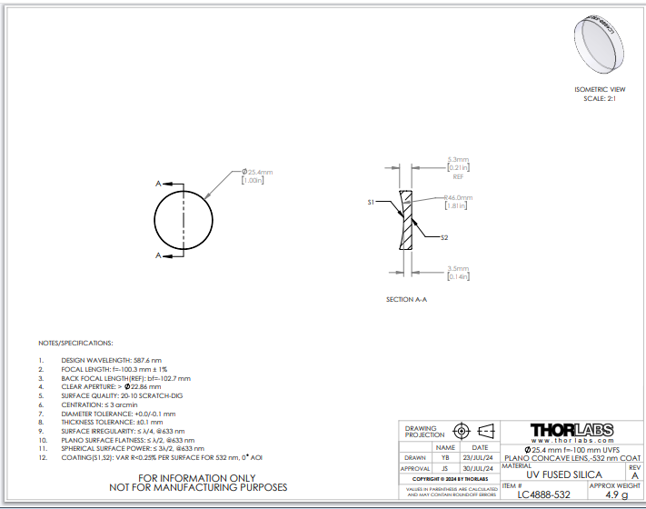 Thorlabs索雷博 LC4888-532 平凹透镜