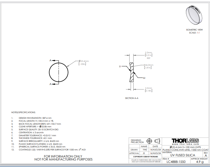 Thorlabs索雷博 LC4888-1550 平凹透镜