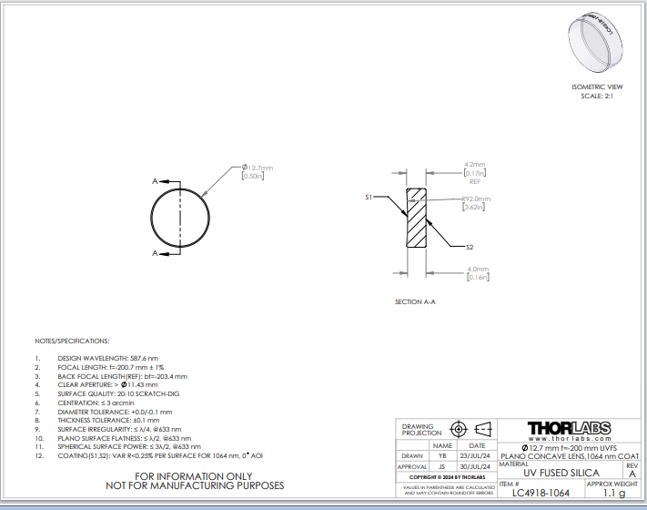 Thorlabs索雷博 LC4918-1064 平凹透镜