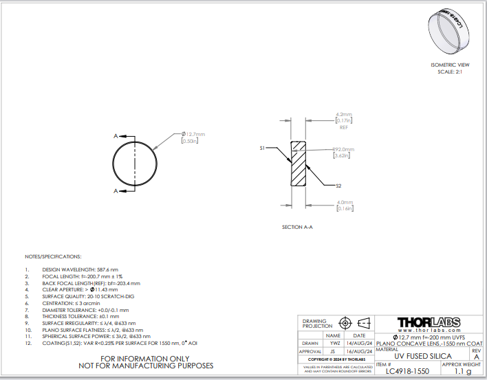 Thorlabs索雷博 LC4918-1550 平凹透镜
