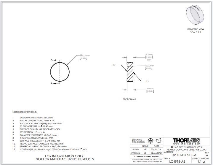 Thorlabs索雷博     LC4918-AB   平凹透镜