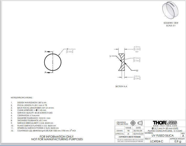 Thorlabs索雷博 LC4924-C 平凹透镜