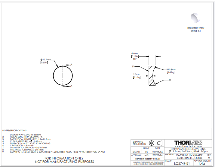 Thorlabs索雷博 LC5749-E1 平凹透镜