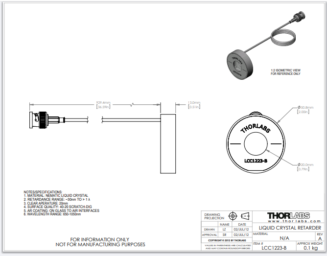 Thorlabs索雷博     LCC1223-B - 全波液晶延迟器