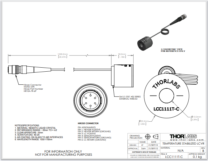 Thorlabs索雷博 LCC1111T-C - 温度稳定液晶延迟器