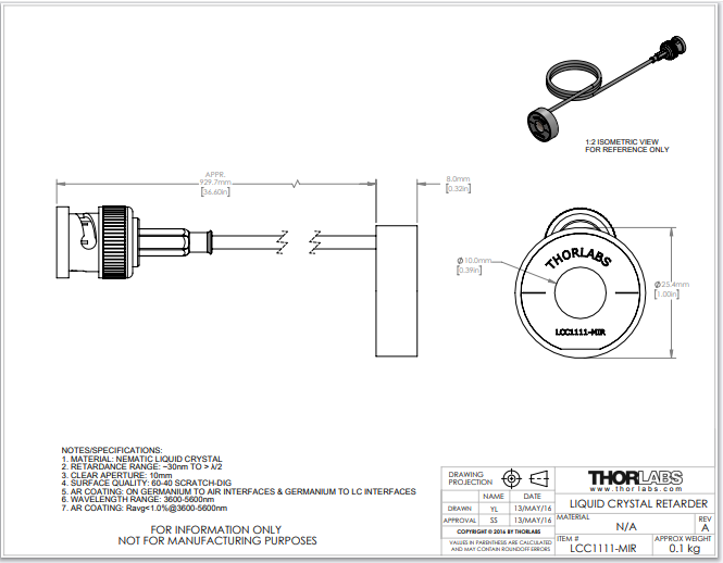 Thorlabs索雷博 LCC1111-MIR - 半波液晶延迟器