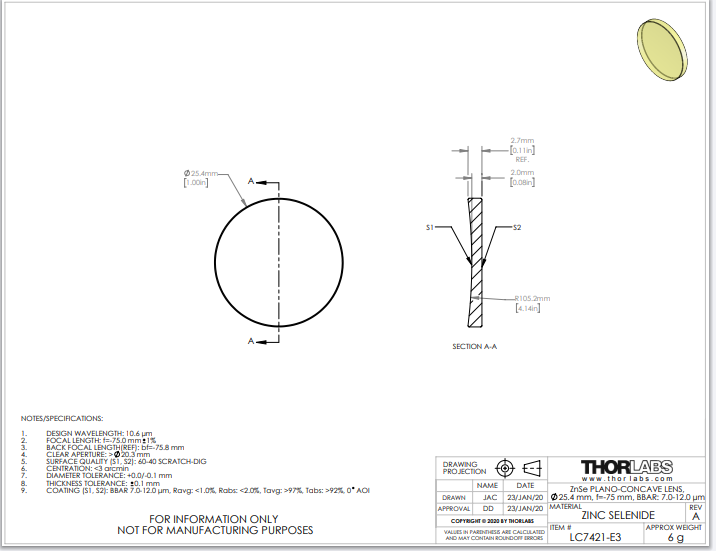 Thorlabs索雷博 LC7421-E3 平凹透镜