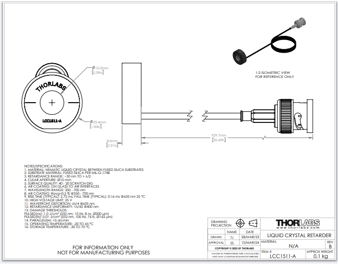 Thorlabs索雷博 LCC1511-A - 快速响应的半波液晶延迟器