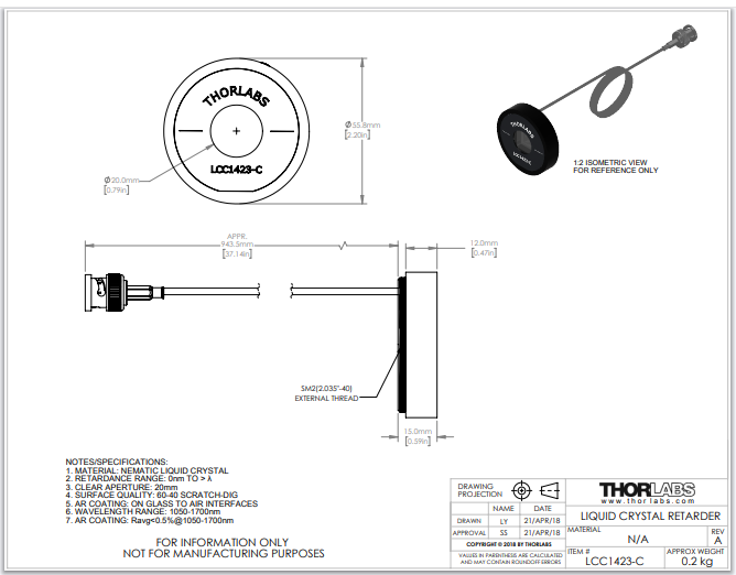 Thorlabs索雷博 LCC1423-C - 全波液晶延迟器