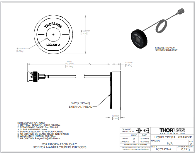 Thorlabs索雷博 LCC1421-A - 半波液晶延迟器