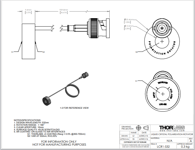 Thorlabs索雷博 LCR1-532 - 液晶偏振方向旋转器