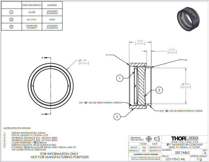 Thorlabs索雷博 LD1170-C-ML 双凹透镜