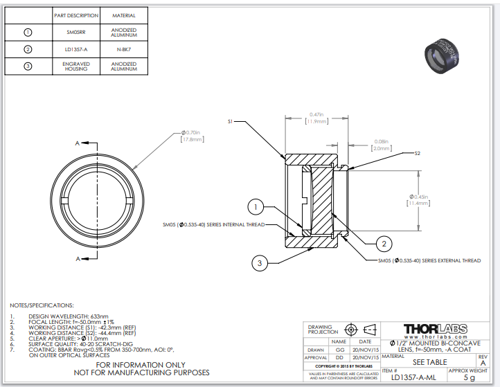 Thorlabs索雷博 LD1357-A-ML 双凹透镜