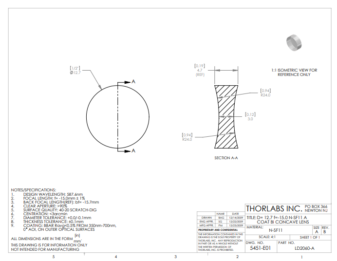 Thorlabs索雷博 LD2060-A 双凹透镜