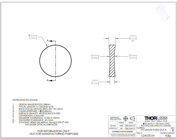 Thorlabs索雷博 LD4103-UV 双凹透镜