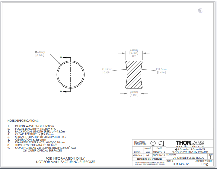 Thorlabs索雷博 LD4148-UV 双凹透镜