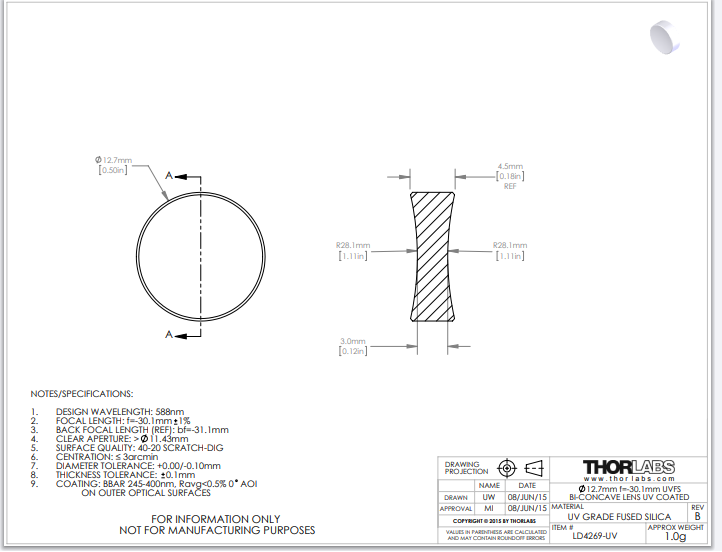 Thorlabs索雷博 LD4269-UV 双凹透镜