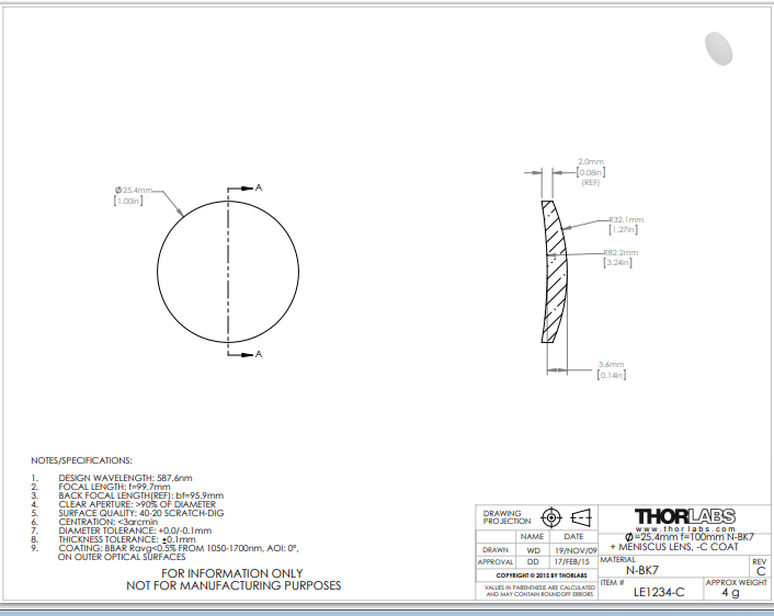 Thorlabs索雷博 LE1234-C 正弯月透镜