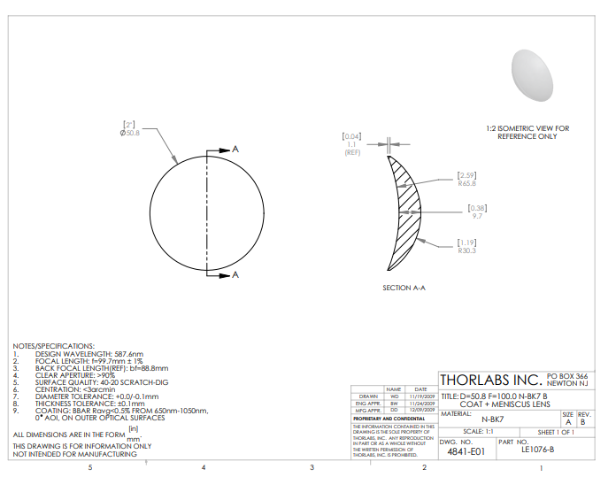 Thorlabs索雷博 LE1076-B 正弯月透镜