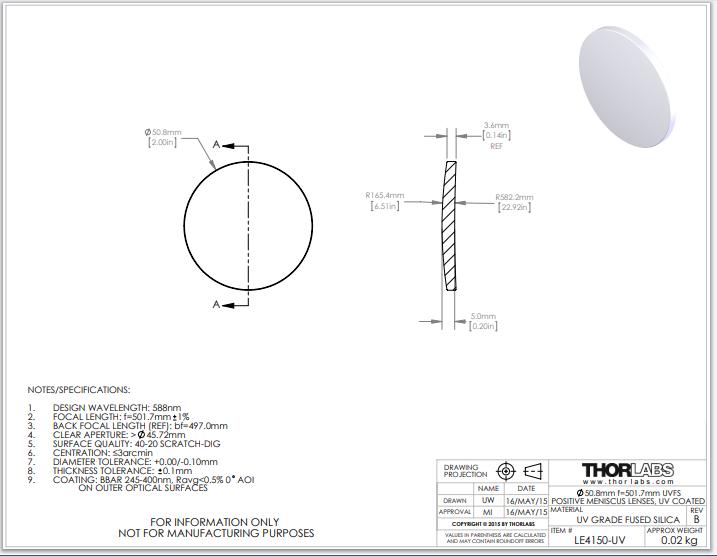 Thorlabs索雷博 LE4150-UV 正弯月透镜