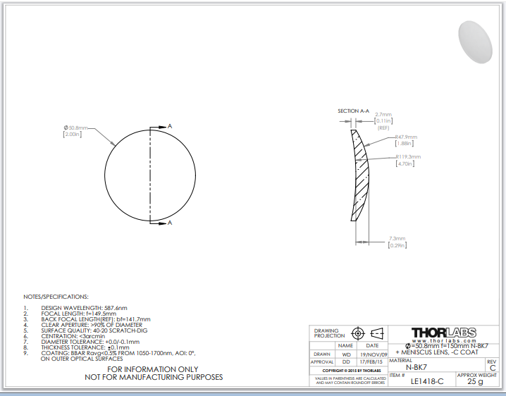 Thorlabs索雷博 LE1418-C 正弯月透镜