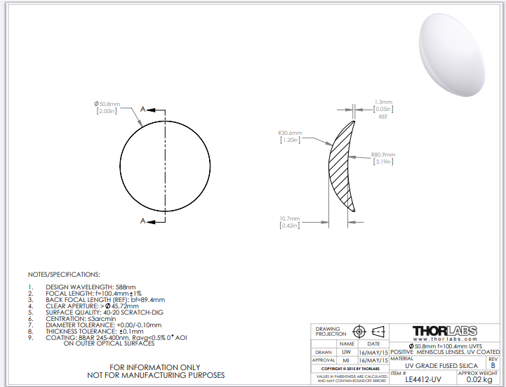 Thorlabs索雷博     LE4412-UV   正弯月透镜
