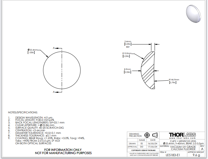 Thorlabs索雷博 LE5183-E1 正弯月透镜