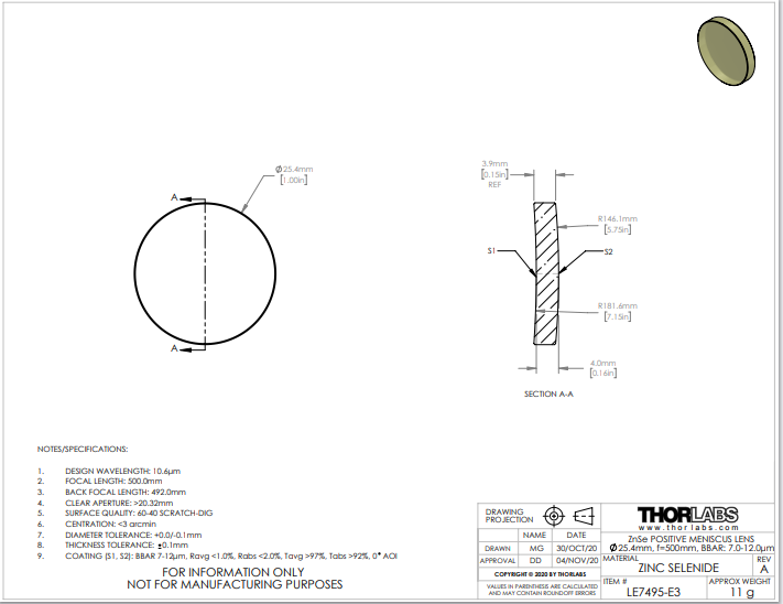 Thorlabs索雷博 LE7495-E3 正弯月透镜