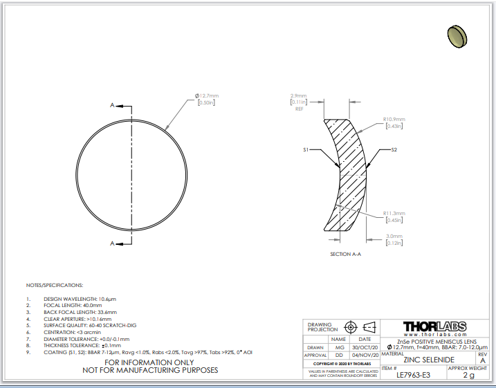 Thorlabs索雷博 LE7963-E3 正弯月透镜