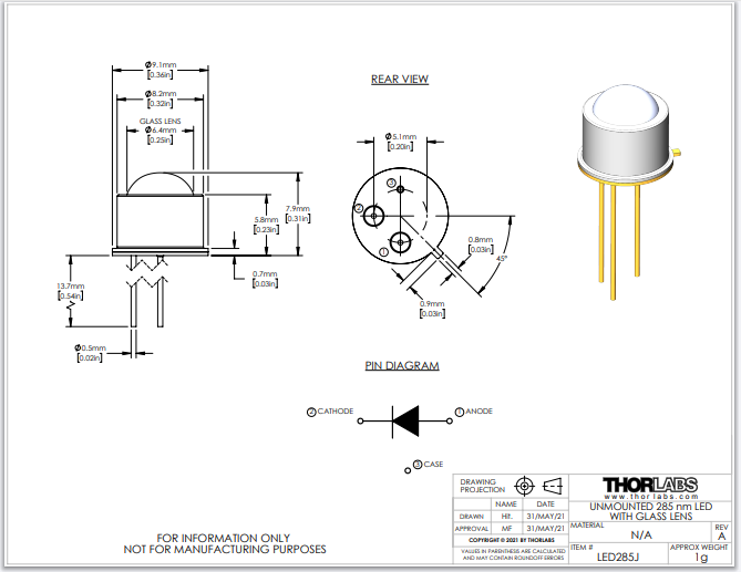 Thorlabs索雷博 LED285J - 285 nm LED