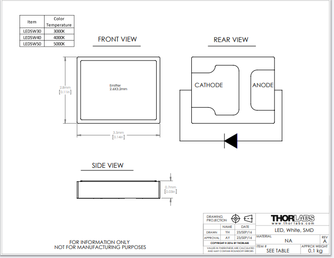 Thorlabs索雷博 LEDSW40 - 白光LED,SMT封装