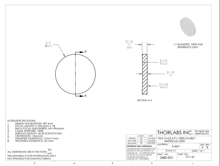 Thorlabs索雷博 LF1141 负弯月透镜