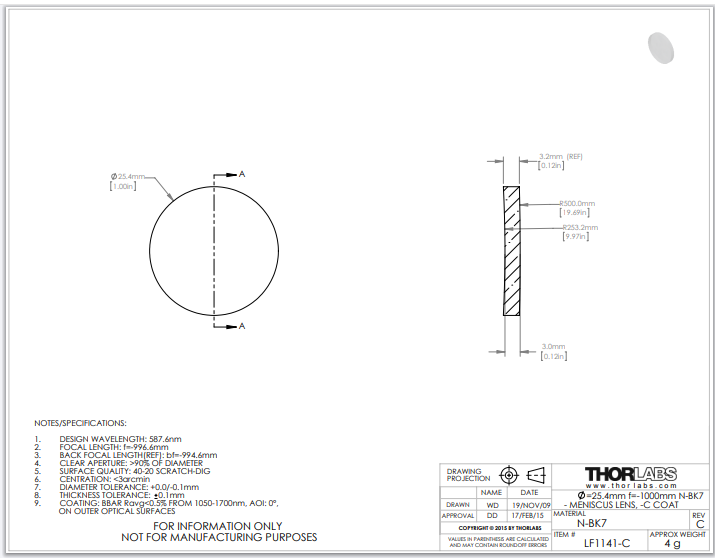 Thorlabs索雷博 LF1141-C 负弯月透镜