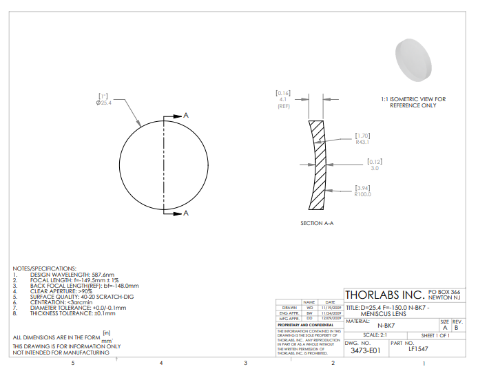 Thorlabs索雷博 LF1547 负弯月透镜