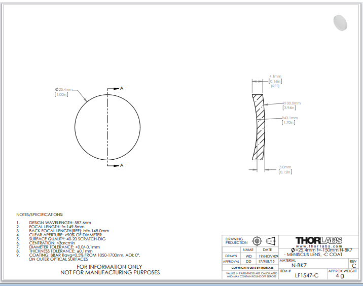 Thorlabs索雷博     LF1547-C   负弯月透镜