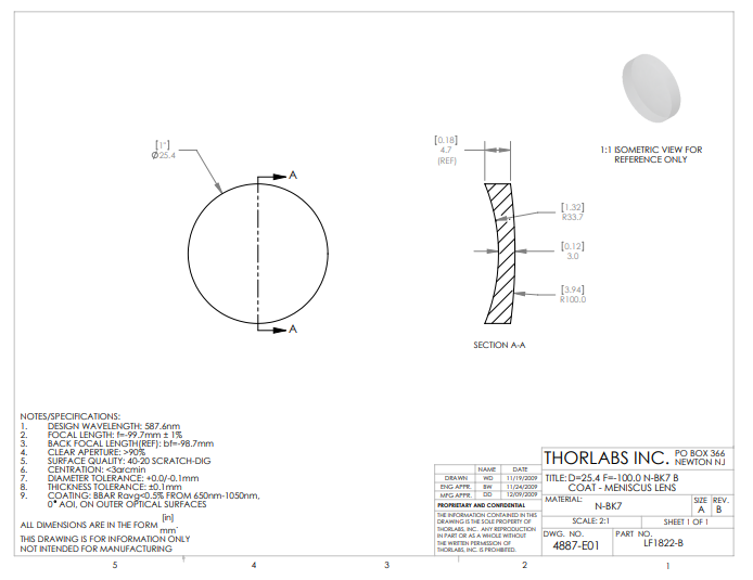 Thorlabs索雷博 LF1822-B 负弯月透镜