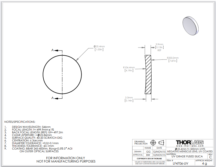 Thorlabs索雷博 LF4706-UV 负弯月透镜