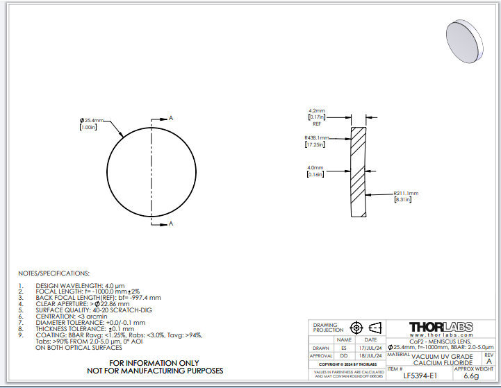 Thorlabs索雷博     LF5394-E1   负弯月透镜