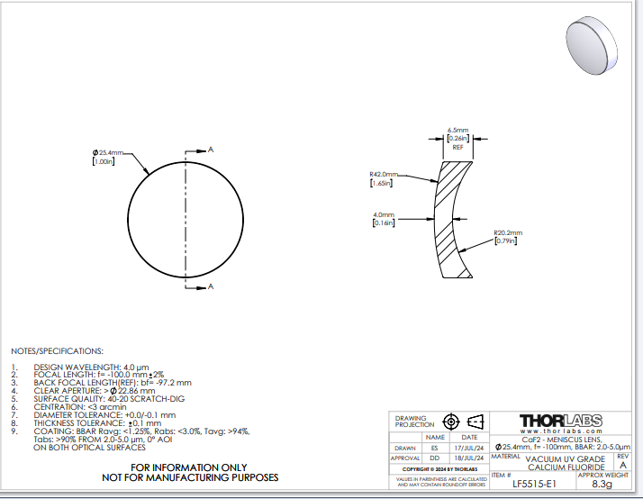 Thorlabs索雷博 LF5515-E1 负弯月透镜