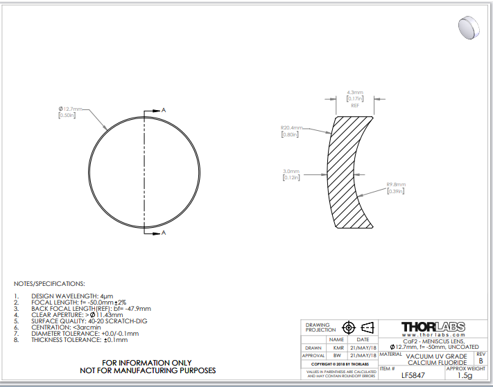 Thorlabs索雷博 LF5847 负弯月透镜