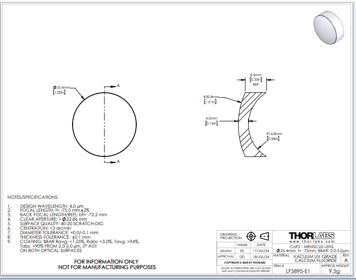 Thorlabs索雷博 LF5895-E1 负弯月透镜