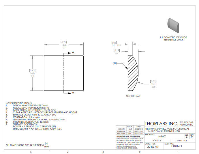 Thorlabs索雷博 LJ1014L1 平凸柱面透镜